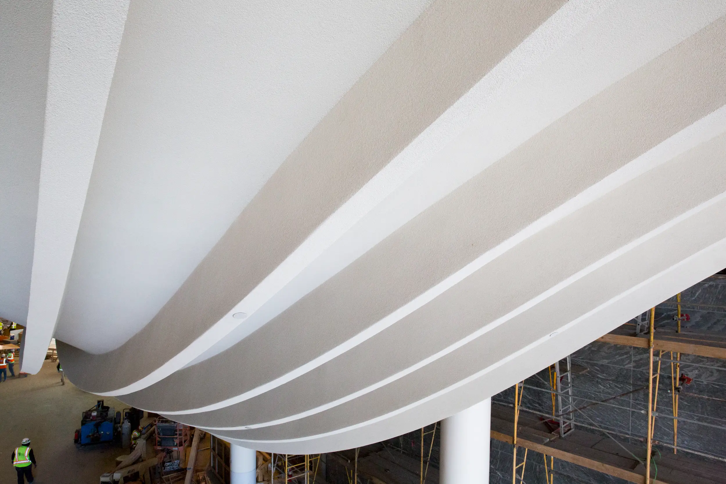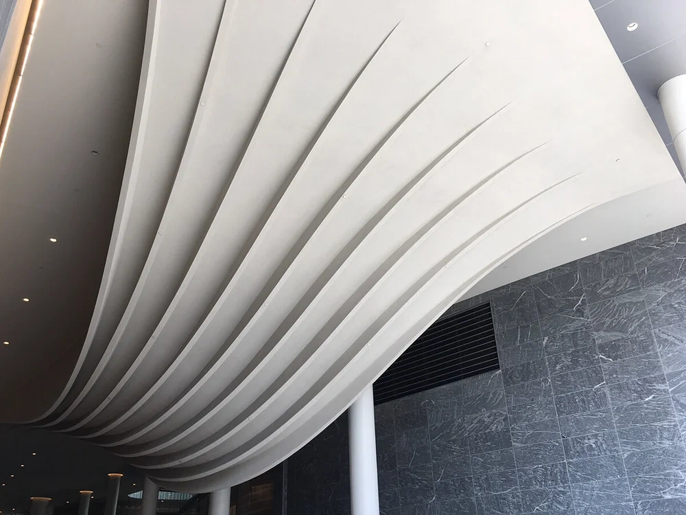 Radius Track was contracted to solve the cold-formed steel framing needs for the port cochère's ribbed swale ceiling feature. We implemented doubly curving stick framing system meeting design intent and California state building code, a color-coded kit of Parts solution for fast and simple installation, and and engineered system complying with rigorous structural requirements.