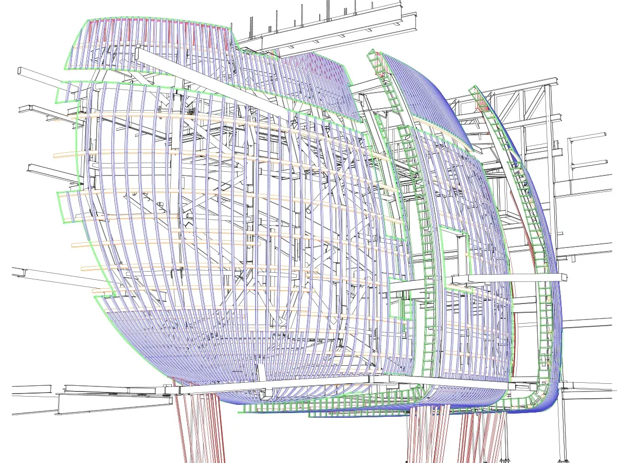 A point-cloud scan of the erected steel was captured and imported into the 3D Rhino model. This allowed Radius Track to compare actual conditions with theoretical geometry and pinpoint discrepancies early.
