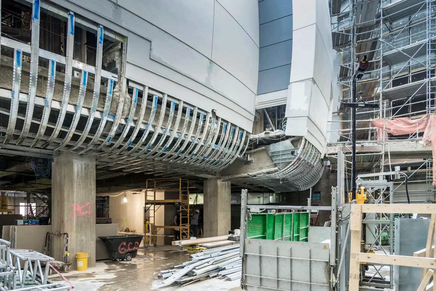 From this coordination, Radius Track engineered a highly adjustable light-gauge framing system. Pre-curved box beams with adjustable outrigger assemblies achieved the required plan curvature. Pre-curved hat channels mounted to the box beams defined the cross-section geometry. This system provided flexibility to accommodate local deviations while fitting within extremely tight spatial constraints.