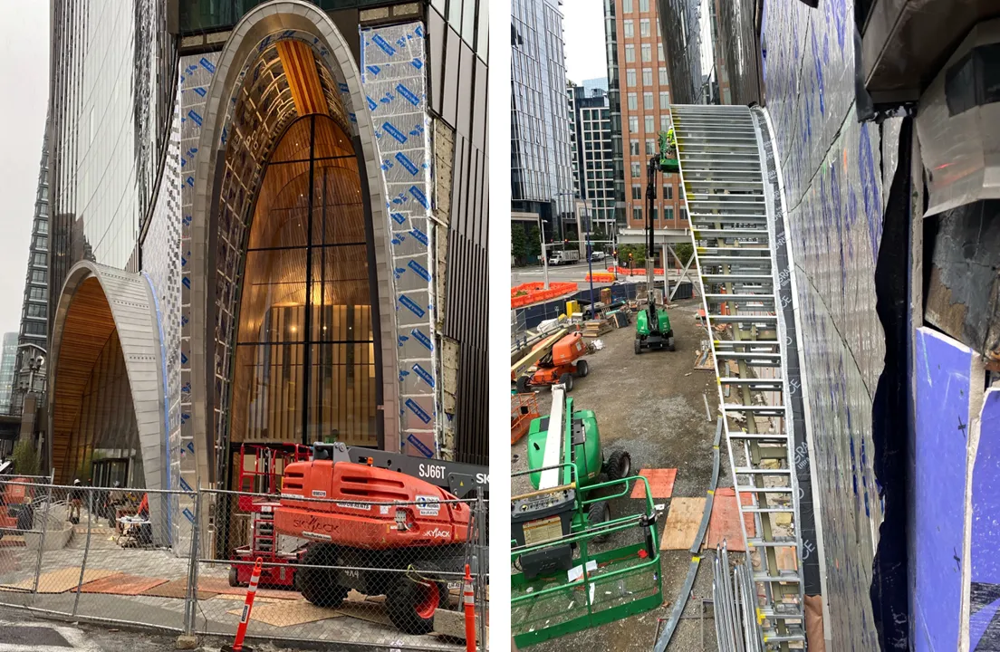 At Boston’s Seaport District’s 10 World Trade tower, the complex design of curved walls, domed ceilings, and wood-finish canopies became a showcase of early collaboration and constructability. By engaging Century Drywall and RadiusTrack early, the project team used coordinated 3-D modeling to establish hanger points, translate freeform curved surfaces into 2-D fabrication geometry, and simplified exterior canopy assemblies. This upfront coordination minimized conflicts, reduced field rework, and enabled clean, efficient installations that honored the architectural intent.